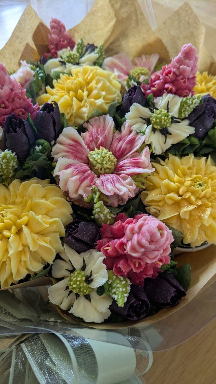 At Cherry & Black, our floral cupcake bouquets make the perfect gift. Your favourite florals in your chosen palette arranged in a beautiful bouquet, wrapped and boxed, ready to be presented to your loved one. 7 Blooms £50, 12 Blooms £75, 19 Blooms £110